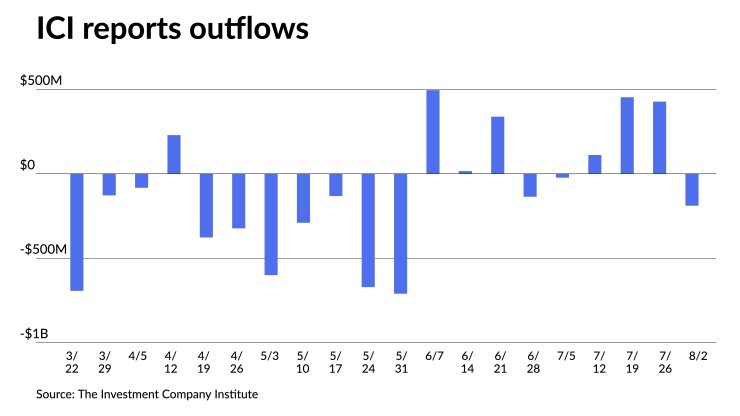 The Investment Company Institute reported investors pulled $189 million out of municipal bond mutual funds the week ending Aug. 2 after $427 million of inflows the week prior. Exchange-traded funds saw outflows of $533 million after inflows of $345 million the previous week.
