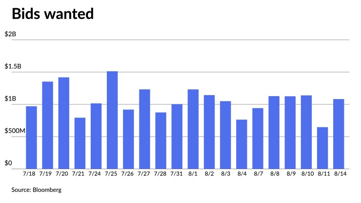 From Wednesday through Aug. 31, they said only $3 billion will be returned, with $1.4 billion being paid out on the last day of the month. New York issuers, mostly New York City, will return $1.3 billion on Aug. 31, according to CreditSights strategists.
