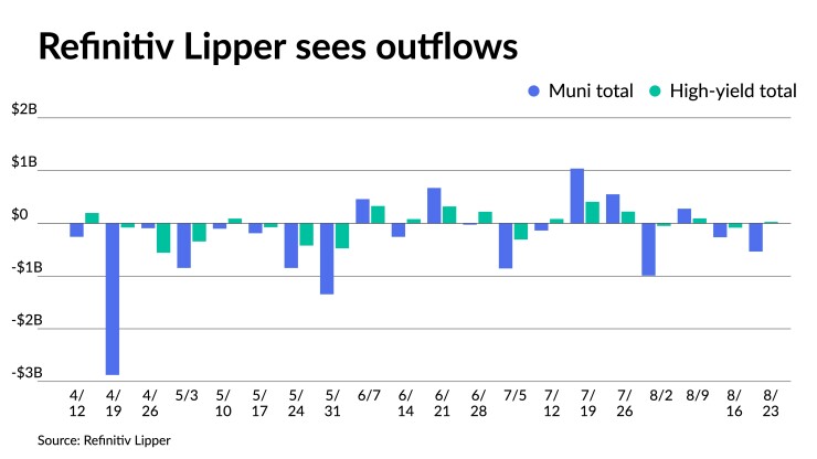 Refinitiv Lipper reported $534.428 million of outflows from municipal bond mutual funds for the week ending Wednesday following $264.046 million of outflows the week prior.