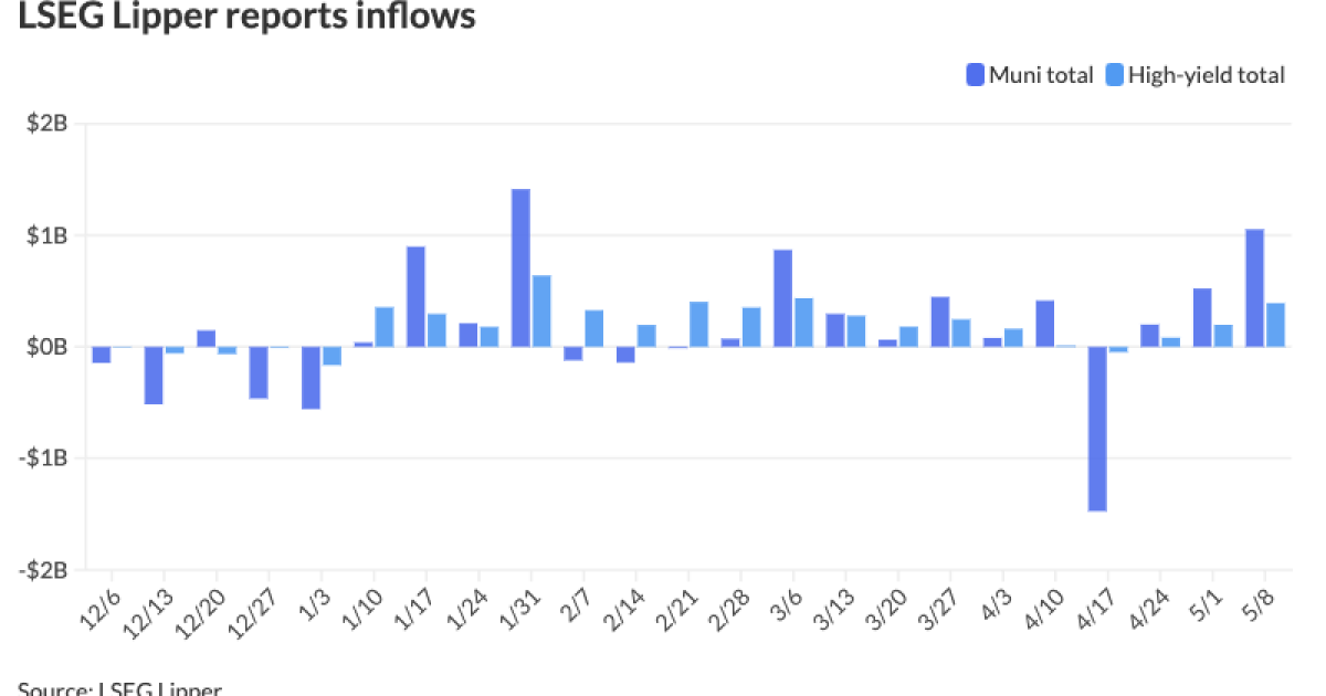 Municipal bond mutual funds saw another week of inflows as investors added $1.053 billion in the week ending Wednesday after $522.2 million the week prior, according to LSEG Lipper. This is the second-largest amount of inflows year-to-date.