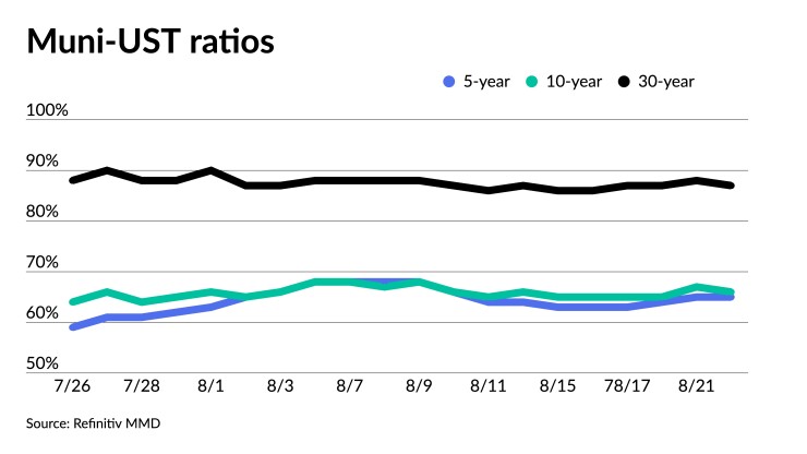 The two-year muni-to-Treasury ratio Tuesday was at 63%, the three-year at 65%, the five-year at 65%, the 10-year at 68% and the 30-year at 89%, according to Refinitiv MMD’s 3 p.m. read. ICE Data Services had the two-year at 65%, the three-year at 66%, the five-year at 65%, the 10-year at 66% and the 30-year at 87% at 4 p.m.